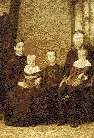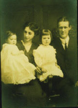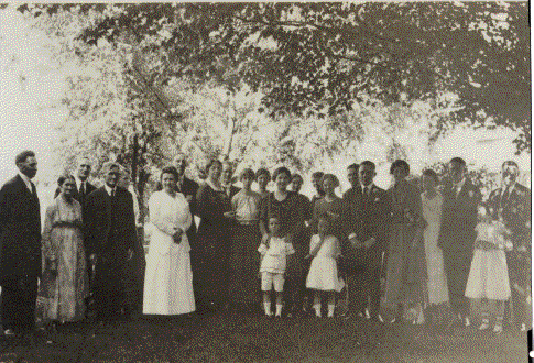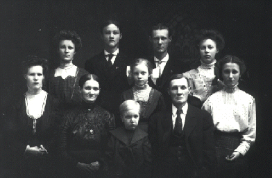 The family group photo includes the gentleman friends of Esther's four sisters, the wives of her two older brothers and the girlfriend of her younger brother, as well as two niece and nephew. The children up front, left to right, are Alice, Karl and Addelle Mysen.